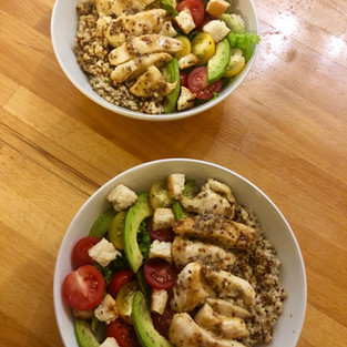 7. Pour l'assemble, déposez le quinoa dans chacun des bols puis ajoutez la salade, les tomates, les tranches d'avocat, les croûtons de pain. Mettre les lamelles de poulet caramélisées par dessus.